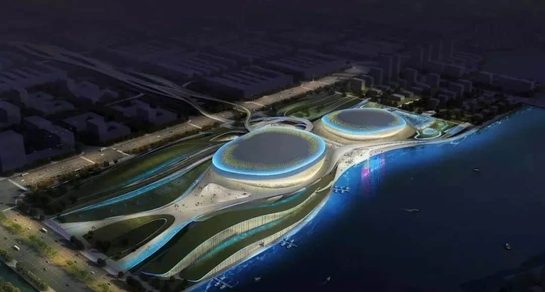 训练馆区等配套设施在绿地之下,蜿蜒伸展,犹如两条绿色的丝带,形象地体现了“一带一路”的内涵。